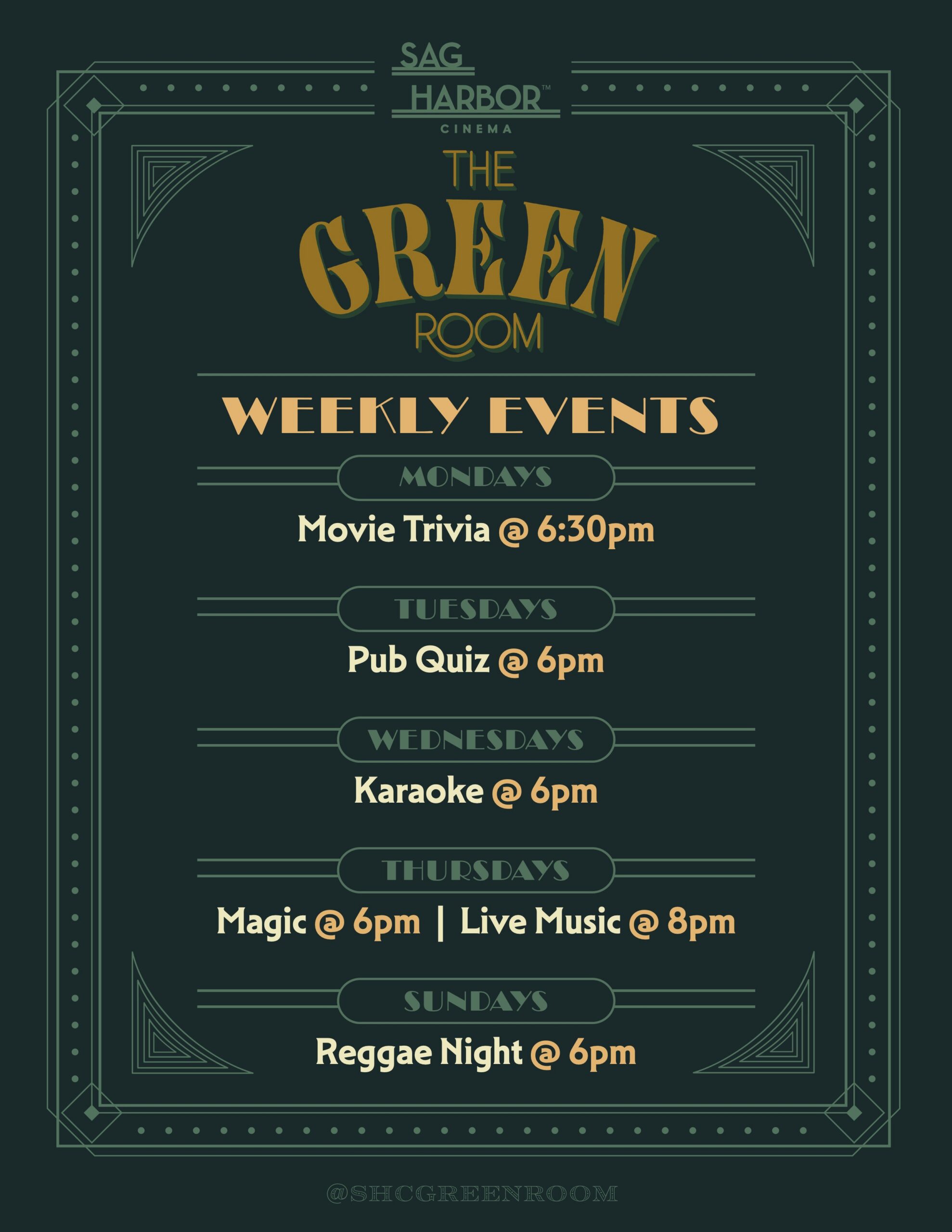 The Green Room Bar is on the third floor inside the cinema building.
